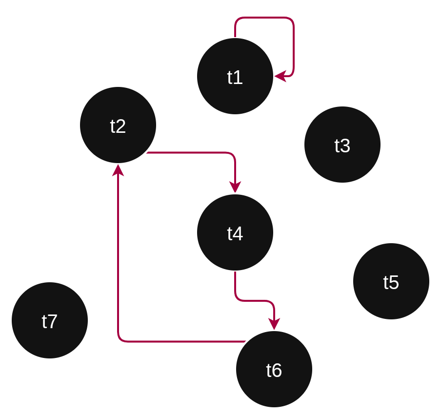 Figure 1. An example of some waiting tasks. Edges involved in cycles are red. Task t1 is waiting for itself. Task t2 is waiting for t4, which is waiting for t6, which is waiting for t2. With deadlock detection, these scenarios would not be allowed to occur.