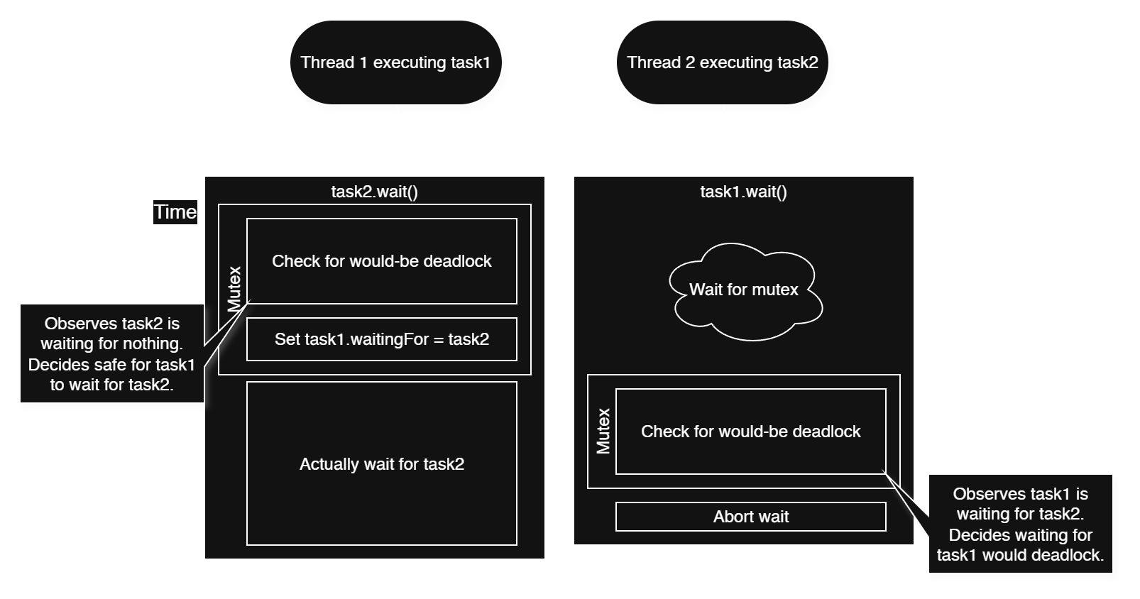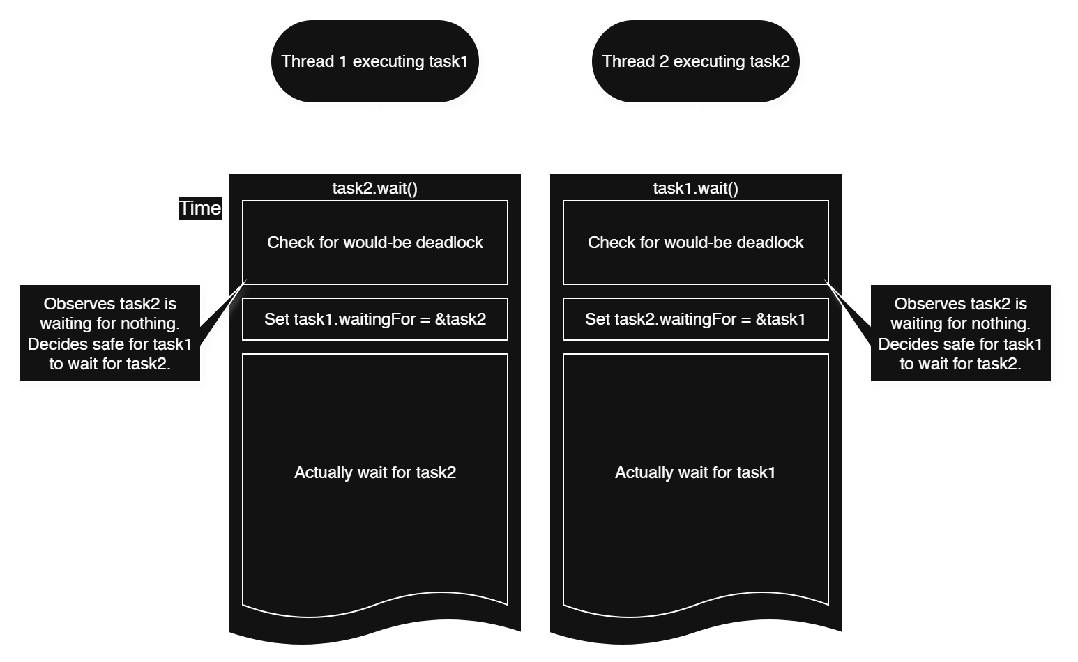 Although the idea is simple, implementing and testing it was not so easy. When wait is called, the first thing we do is check whether the caller is executing a pool task. If it’s not, (for example, the caller of wait could be main()), we know right away that this wait can’t possibly create a cycle in the waiting task graph, because it doesn’t even create an edge. Only a task waiting for a task creates an edge. The implementation uses a thread-local task pointer2 in order to know which task the current thread is executing, if any. From now on, let us assume the caller is in fact executing a task, so we have to proceed with checking for a deadlock.