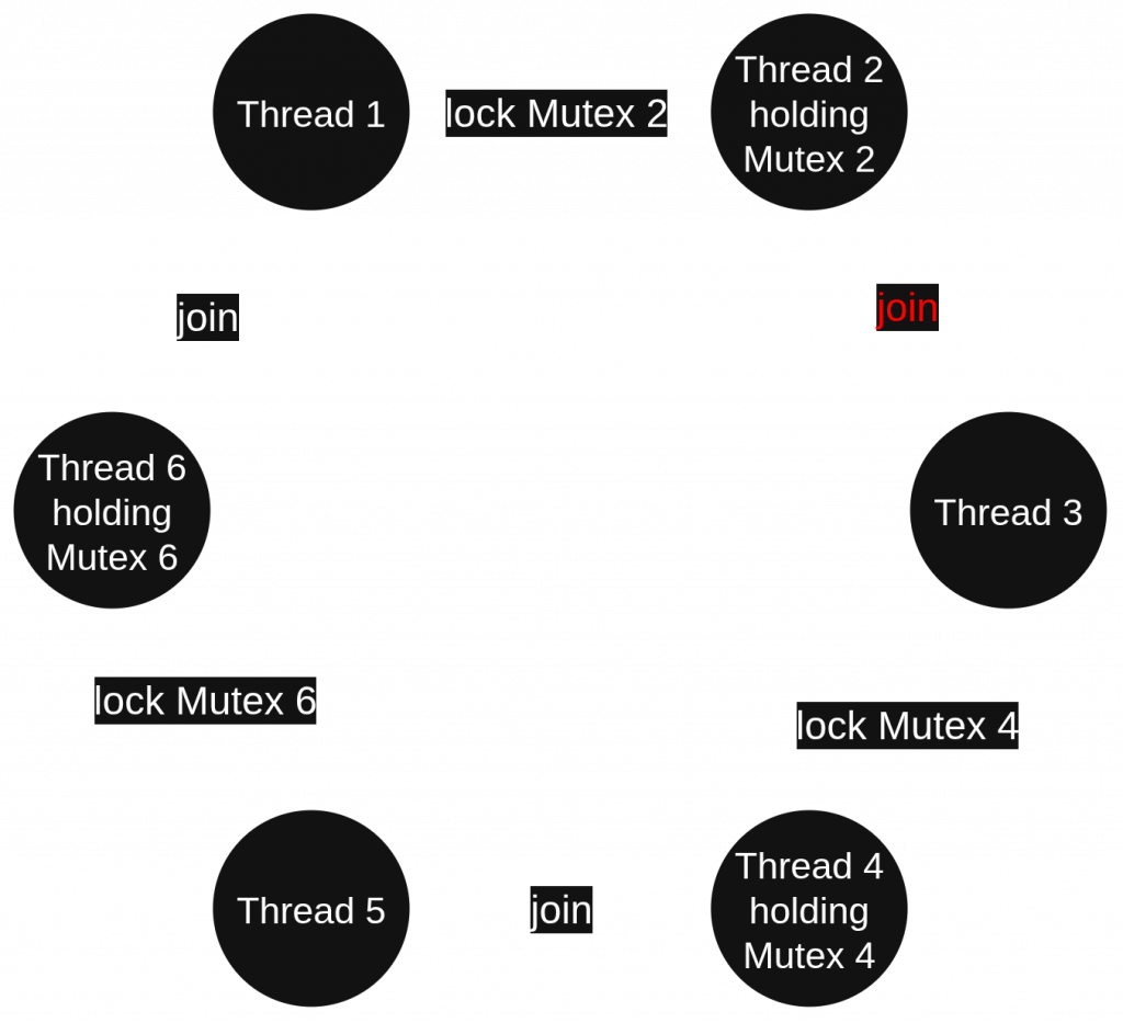 Thread “2” (0x7f36a2c0b6c0) created a deadlock involving 6 threads and 3 mutexes by joining thread “3” (0x7f36a240a6c0):