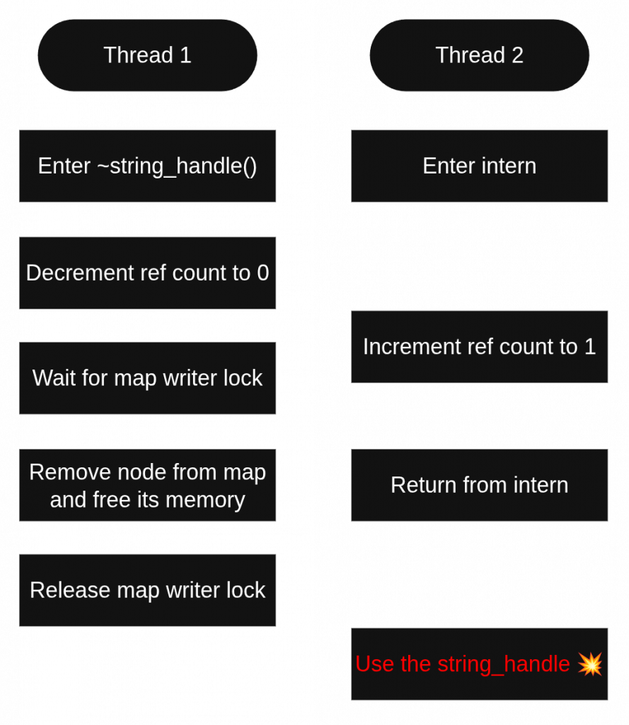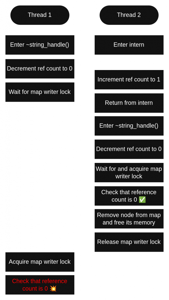 In the scenario shown in Figure 2, Thread 1 decrements the reference count to zero, so it decides to to delete the node and free the memory. But during that time, Thread 2 incremented the reference count back up to 1. This could happen if Thread 2 interned a string with the same content as the one that’s about to be deleted. This will cause a use-after-free sooner or later, as Thread 2 now holds a string_handle that points to a node that’s been freed.