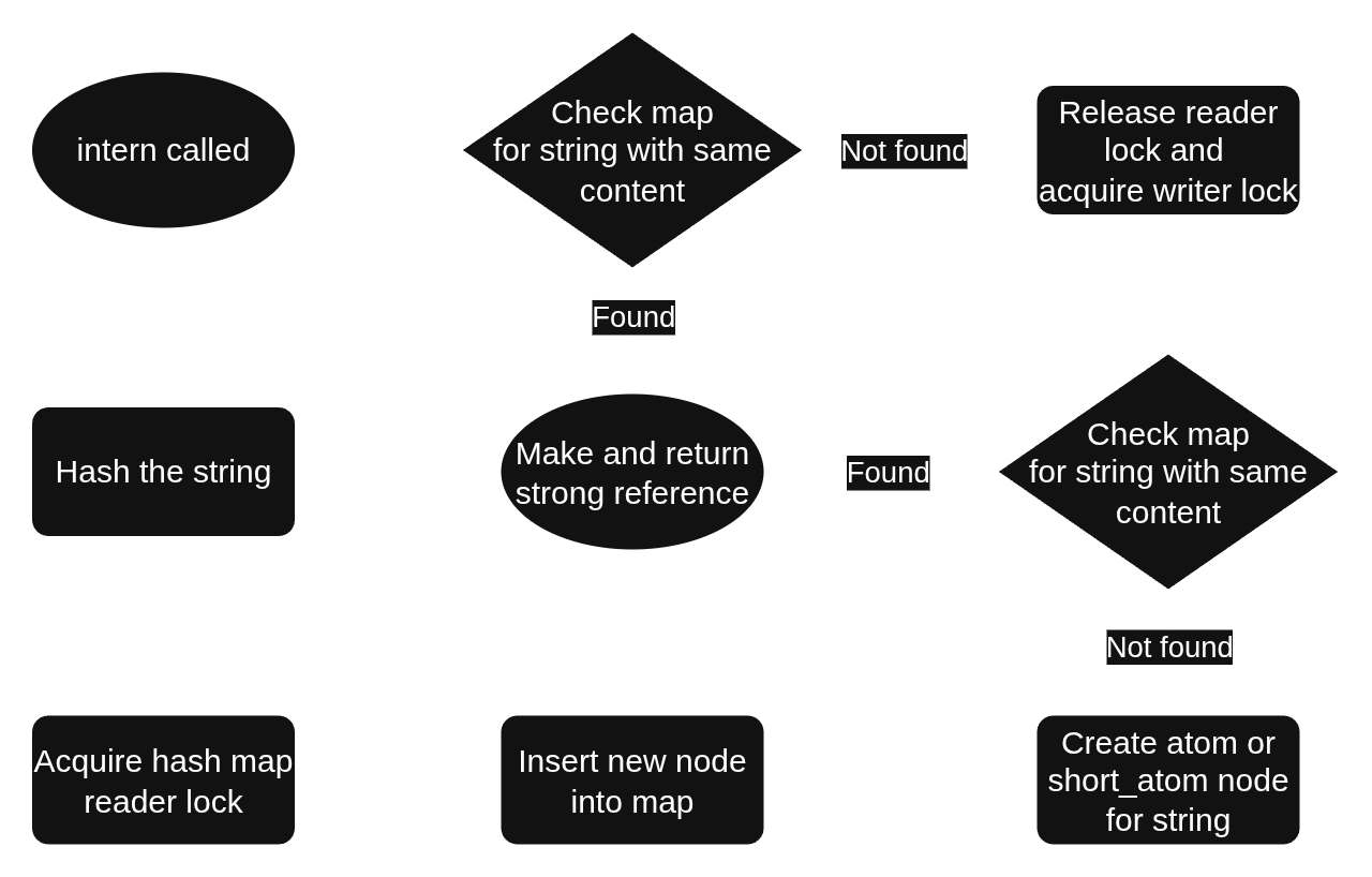 First, we compute a hash of content of the string argument. We then take a reader lock on the hash map. Note that we compute the hash before taking the lock, because the hash computation is unaffected by the hash map (or any other shared state), and the less time we hold the lock, the better for performance. We then try to find the given string in the map, using the hash as the key. If successful, we make a (strong) string_handle from the weak_string_handle found in the table and return it from intern.